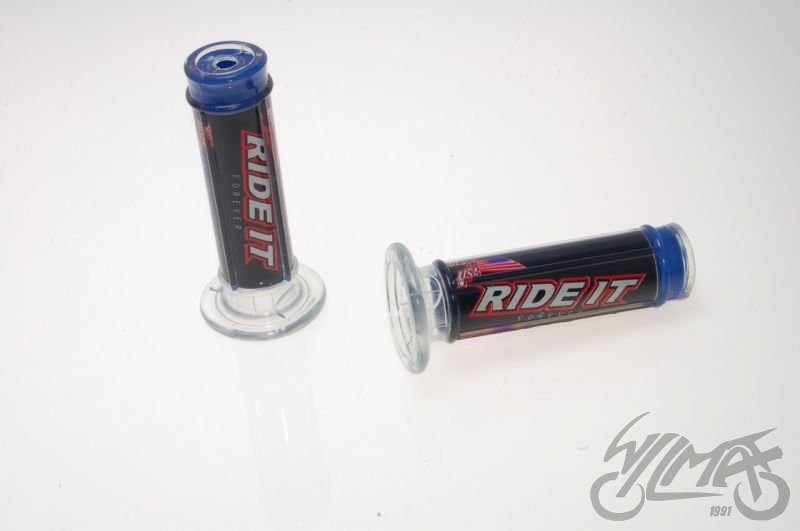 Gumové gripy řidítek. Sada obsahuje grip s průměrem 22mm a větší grip na plynovou rukojeť. Gripy nesou nápis Ride It.
