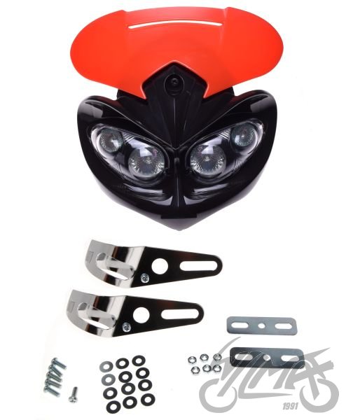 Přední univerzální maska pro motocykl v červené barvě s držáky a čtyřmi halogenovými světly.