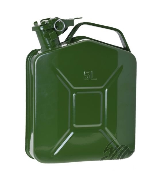 Plechový kanystr o objemu 5 litrů. Pro naftu i benzín.