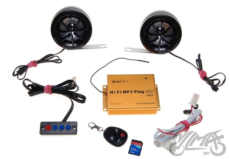 Motocyklový MP3 přehrávač s reproduktory a alarmem. Sastava je určena především pro instalaci do skůtrů. Ovládá se prostřednistvím malého panelu, který lze přidělat libovolně na řidítka nebo jiné vhodné místo. Hudbu je možné přenášet do modulu pomocí USB rozhraní nebo na SD kartě. alarm je ovládaný dálkovým ovladačem.