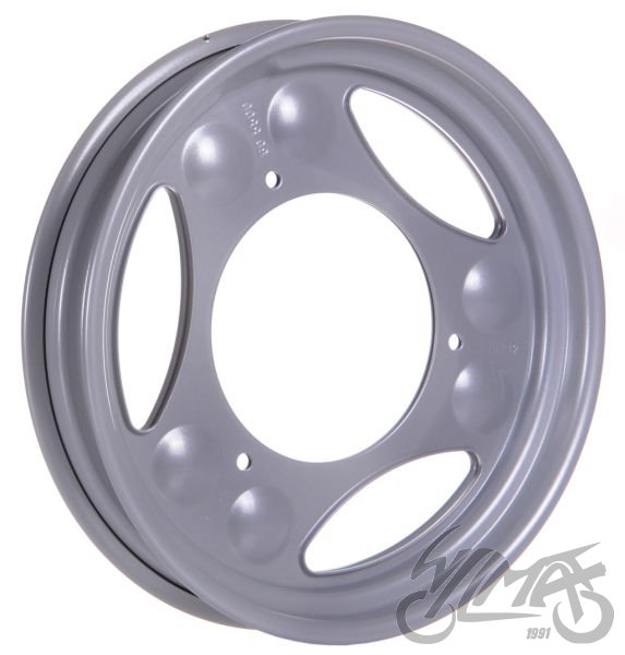 Ocelový ráfek kola motocyklu Simson SR50. Stříbrně lakované provedení.