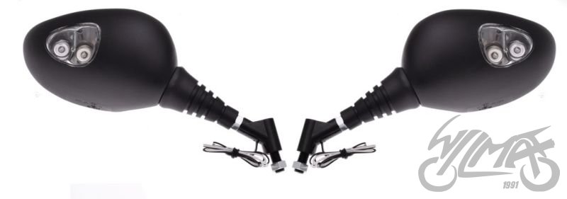 Sada univerzálních zrcátek se závitem M10. Zrcátka jsou homologovaná vybavena LED blikači.